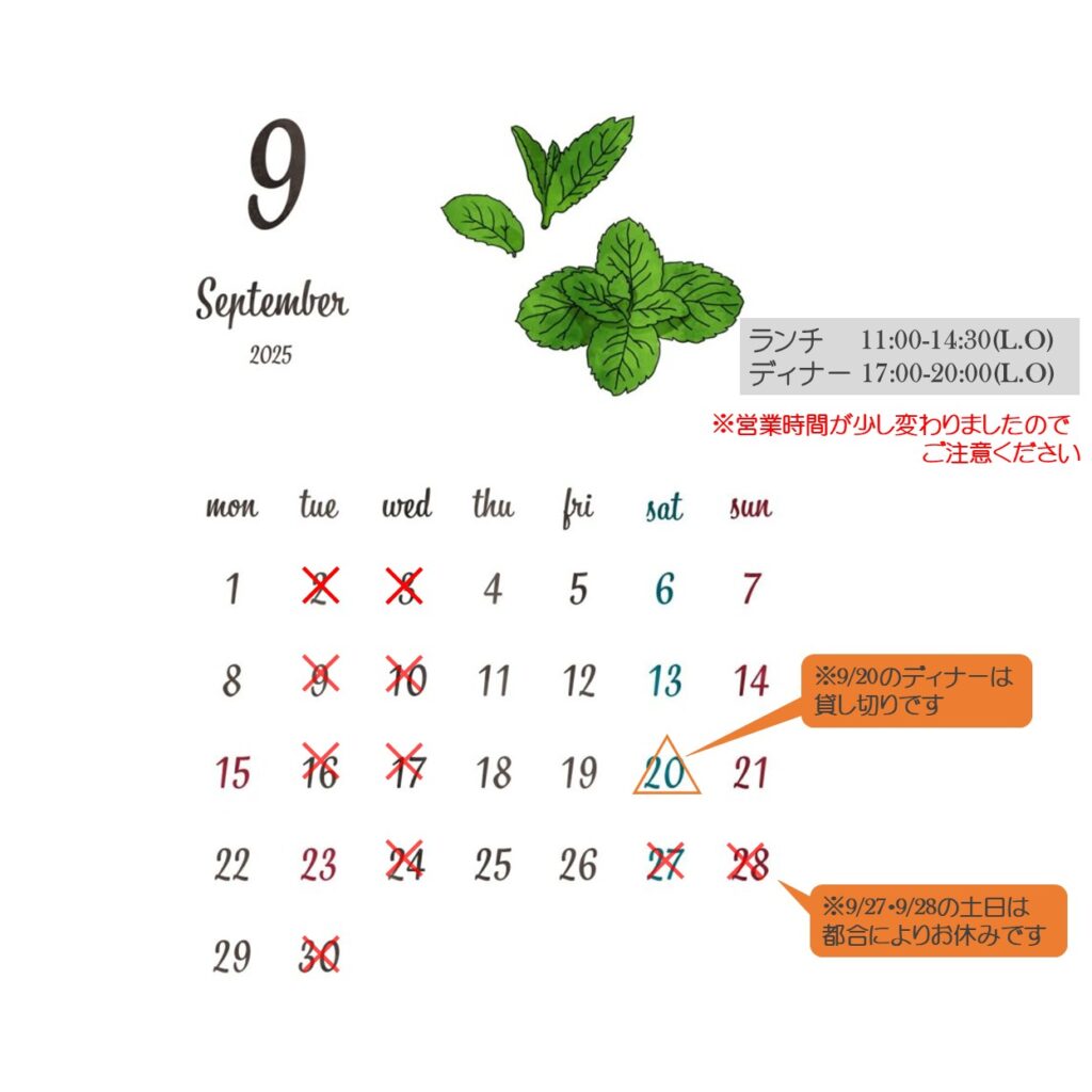 いつもありがとうございます 2025年9月の営業時間のお知らせです 9/23祝日(火)は通常営業、9/20(土)はディナータイムが貸し切りです 9/27(土)9/28(日)は、都合によりお休みです 今月もよろしくお願いいたします!