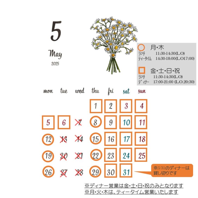 2025年5月 営業日のお知らせ