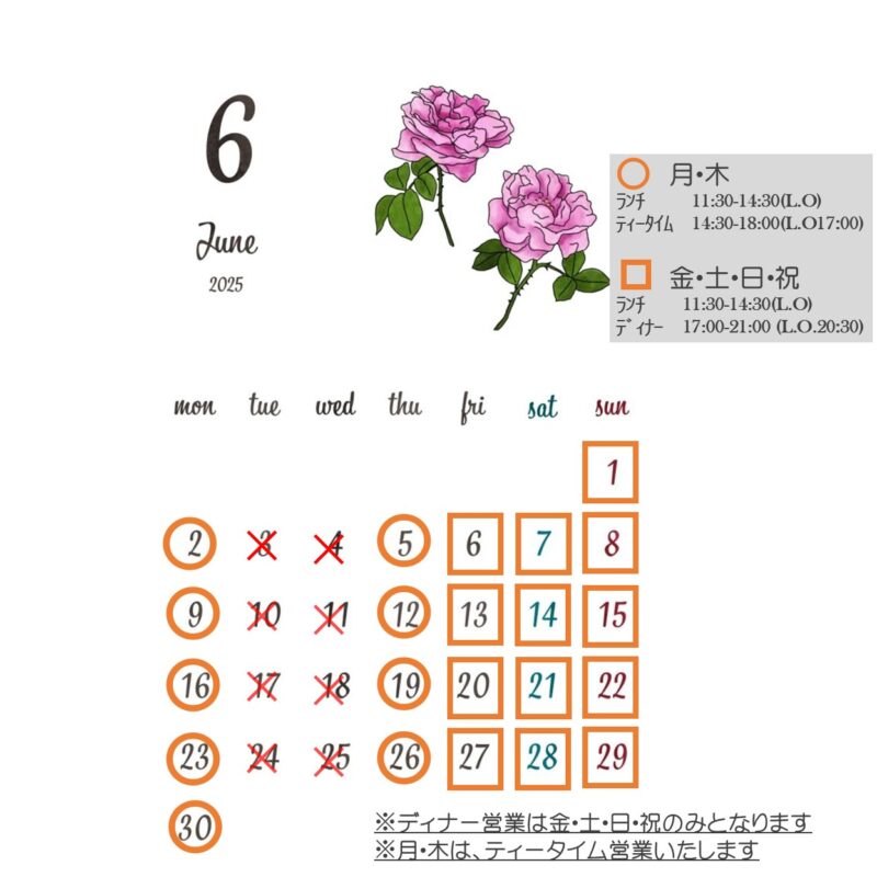 2025年6月 営業日のお知らせ(ピザお休みの日があります)
