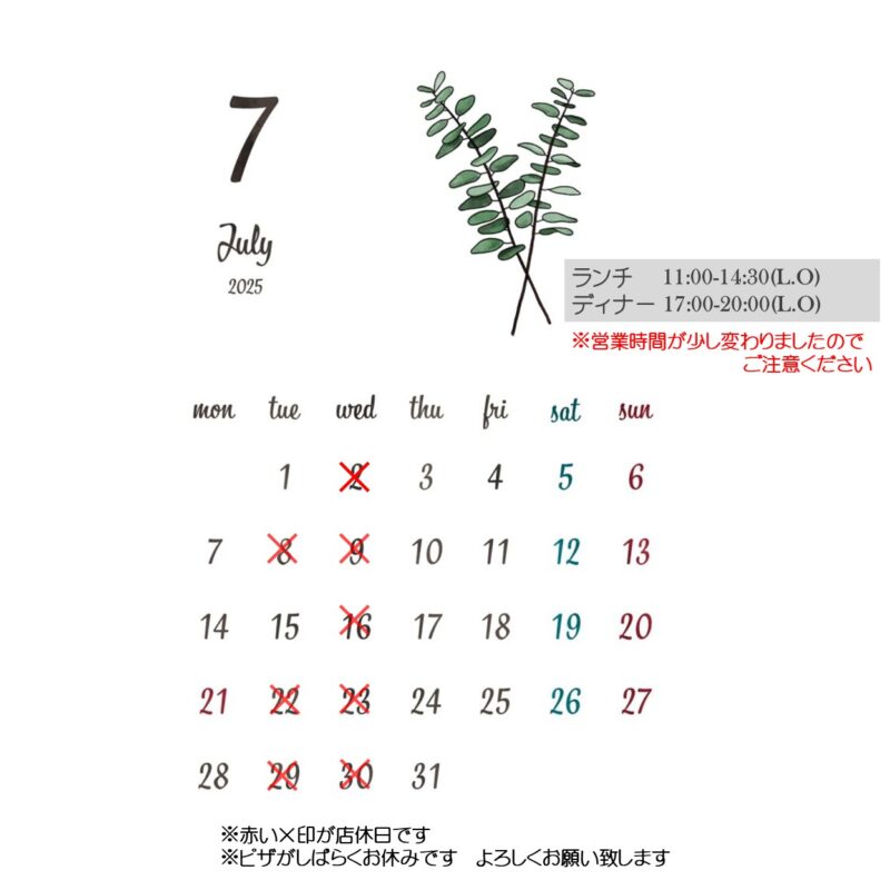 2025年7月 営業日のお知らせ (しばらくピザがお休みです)