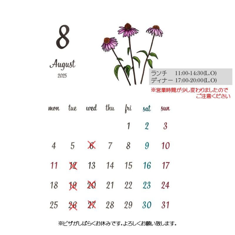 2025年8月 営業日のお知らせ(しばらくピザがお休みです)